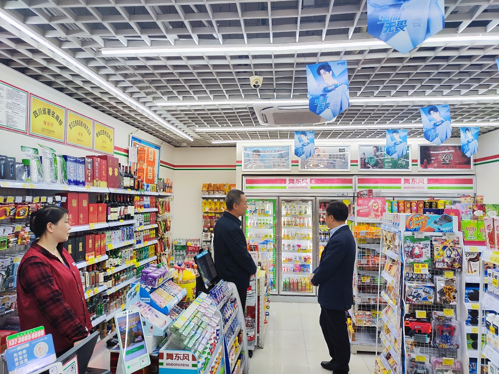辜常委一行来到舞东风位于成都市高新区的线下门店,详细参观了超市的各个区域,包括基础食品区域、休闲食品区域、饮品区域以及日用品区域等。公司董事长张睿向辜学斌常委介绍了舞东风的发展历程、经营理念以及未来发展规划,并对企业发展过程中遇到的困难与问题进行了深入的探讨。