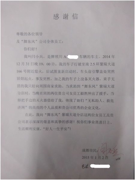 我叫闫小兵,是牌照川A.00000车辆的车主。20141231日晚19:00许,我的车子行驶至南2.5环紫瑞大道166号附近熄火,后试图重新启动时,车头前引擎盖处突然冒烟起火。事发突然,加之我的车子上没灭火器,束手无策的我只好向周围商家求助。当求助到“舞东风”紫瑞大道分店时,当晚在班的两位贵公司女员工毅然伸出了援手,当即把手边的灭火器借给了我,体现了她们“无私助人、救危济困”的高尚的个人品质和贵公司优秀的企业文化。